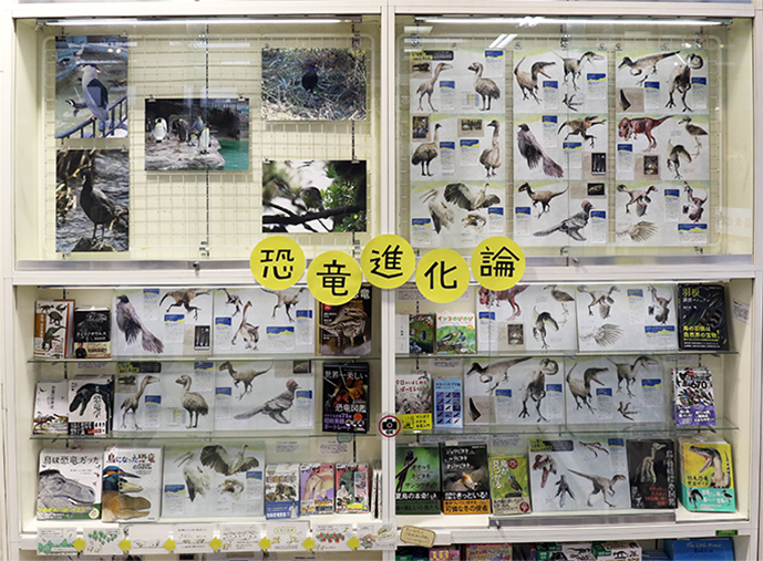 昨今の恐竜研究には欠かせない、羽毛恐竜や鳥への進化などの本を中心に並べています。